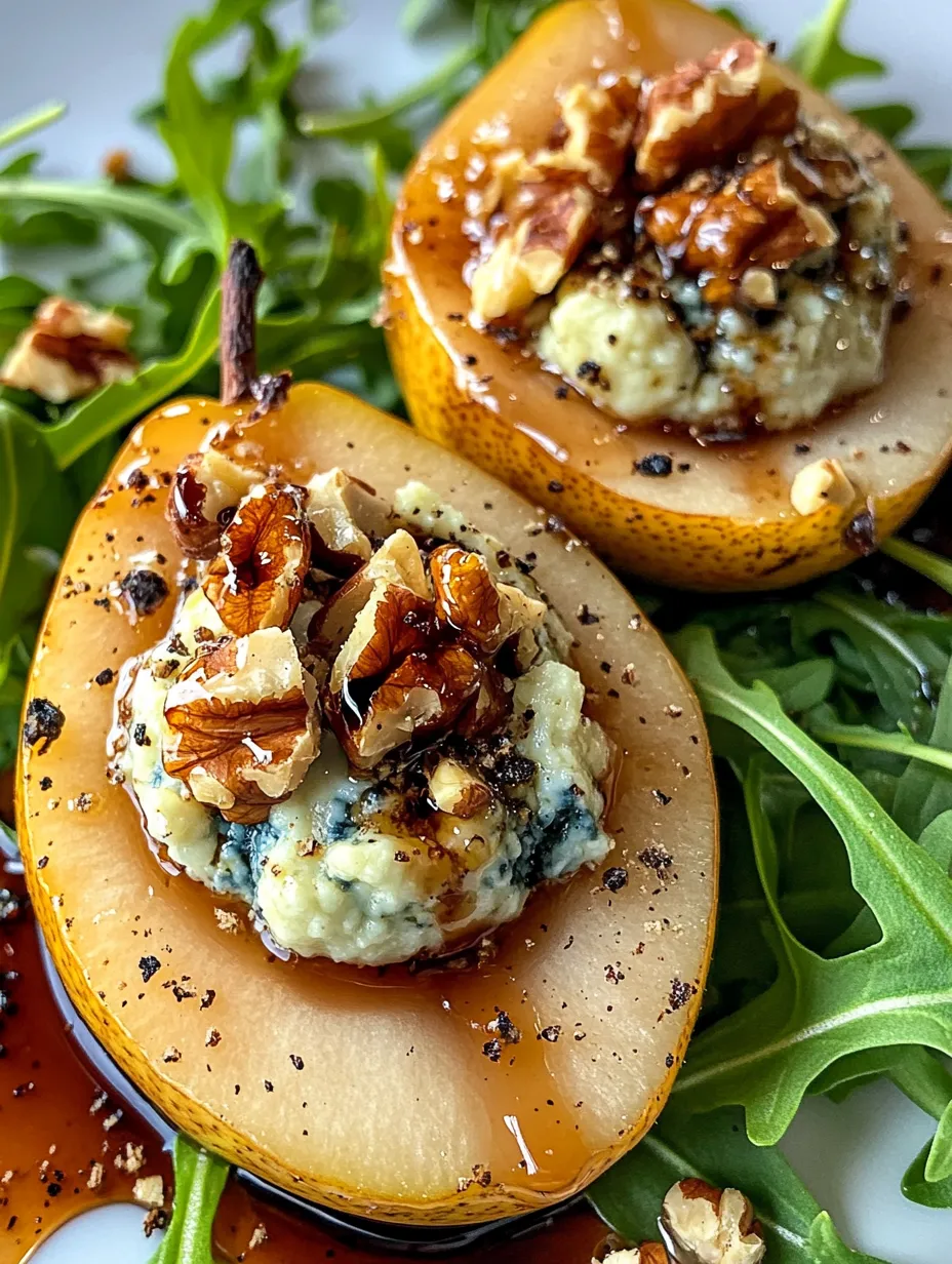To finish off your Blue Cheese Stuffed Pears, consider adding garnishes that will elevate both the presentation and taste of the dish. Arugula is a fantastic choice, offering a peppery bite that complements the sweetness of the pears and the richness of the cheese. A drizzle of balsamic glaze not only adds a touch of elegance to the presentation but also introduces a sweet-tart flavor that brings all the elements together beautifully.