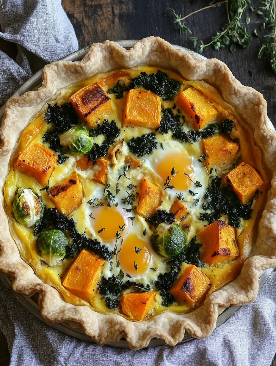 This quiche showcases seasonal ingredients, bringing together the earthy sweetness of butternut squash, the robust flavor of Brussels sprouts, and the nutrient-packed goodness of kale. Quiche is a fantastic way to incorporate these fresh vegetables into your diet, providing a meal that is as beneficial as it is delightful. The combination of eggs and whole milk creates a creamy filling that envelops the vegetables, while Gruyère cheese adds a touch of indulgence and depth of flavor.