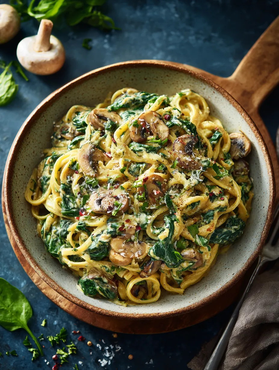 Opt for colorful dishware that contrasts with the creamy pasta. White plates work wonders for showcasing the vibrant greens of the spinach and the earthy tones of the mushrooms.