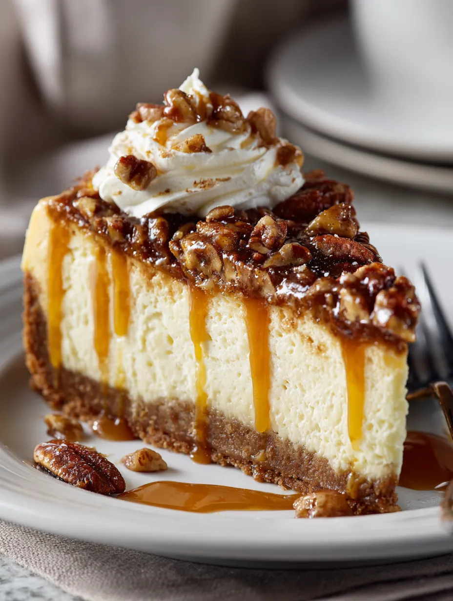 Combination of textures: Creamy cheesecake, crunchy pecans, and smooth caramel create a delightful contrast.