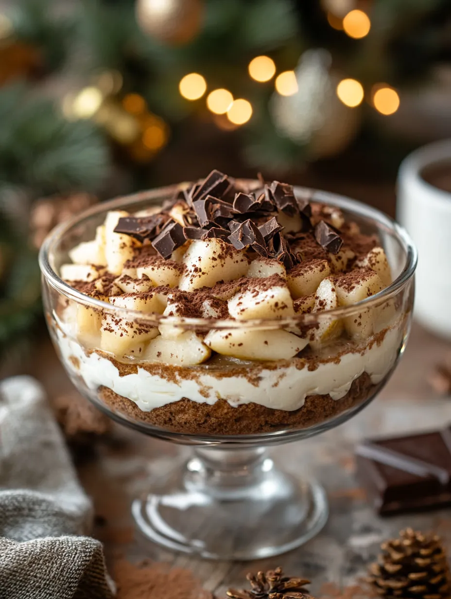 To finish off the Festive Spiced Pear Tiramisu, a dusting of cocoa powder and grated chocolate adds a touch of elegance and visual appeal. These garnishes not only enhance the presentation but also provide a contrasting flavor that ties the whole dessert together.