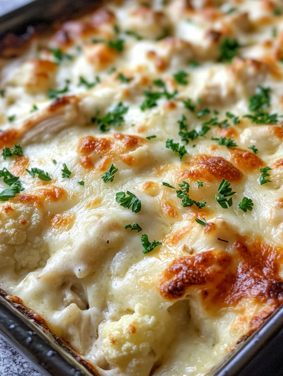Instead of traditional pasta, we use cauliflower as the primary vegetable in this casserole. This low-carb alternative is packed with vitamins C and K, fiber, and antioxidants, which help support overall health. Cauliflower can be roasted, steamed, or riced, making it an incredibly adaptable ingredient. Its mild flavor absorbs the rich Alfredo sauce beautifully, ensuring that you won’t miss the carbs typically found in pasta dishes.