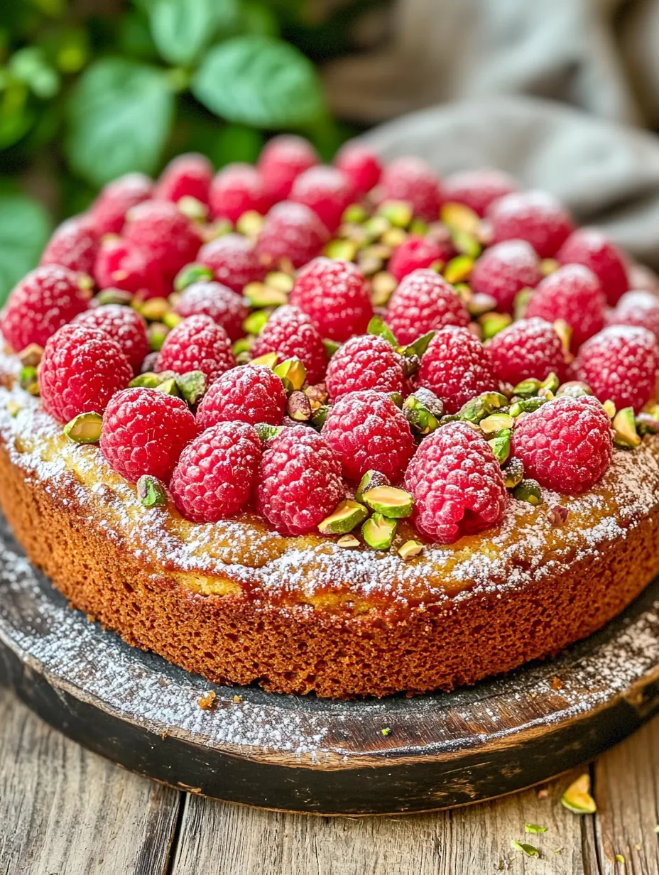 3. Texture Contrast: The pistachios provide a lovely texture contrast to the soft ricotta and juicy raspberries, enhancing the overall experience of the cake with every bite.