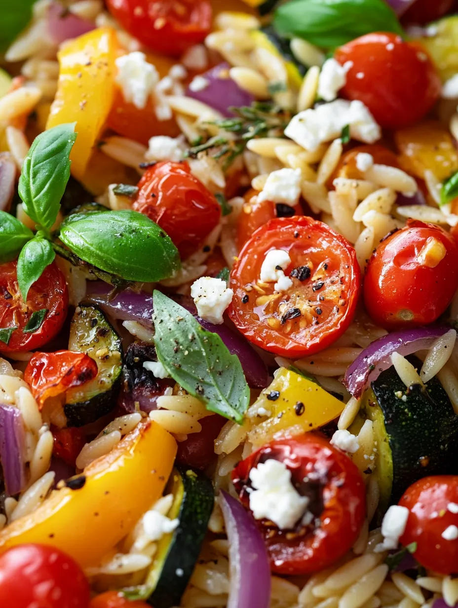 The beauty of Roasted Vegetable Orzo lies in its versatility, allowing you to customize the vegetable medley to your liking. Common choices include bell peppers, zucchini, cherry tomatoes, and red onions—all of which bring their unique flavors and nutritional benefits to the dish. For instance, bell peppers are rich in vitamin C, while zucchini provides hydration and fiber. Roasting these vegetables enhances their natural sweetness and creates a lovely caramelized flavor that complements the orzo perfectly.