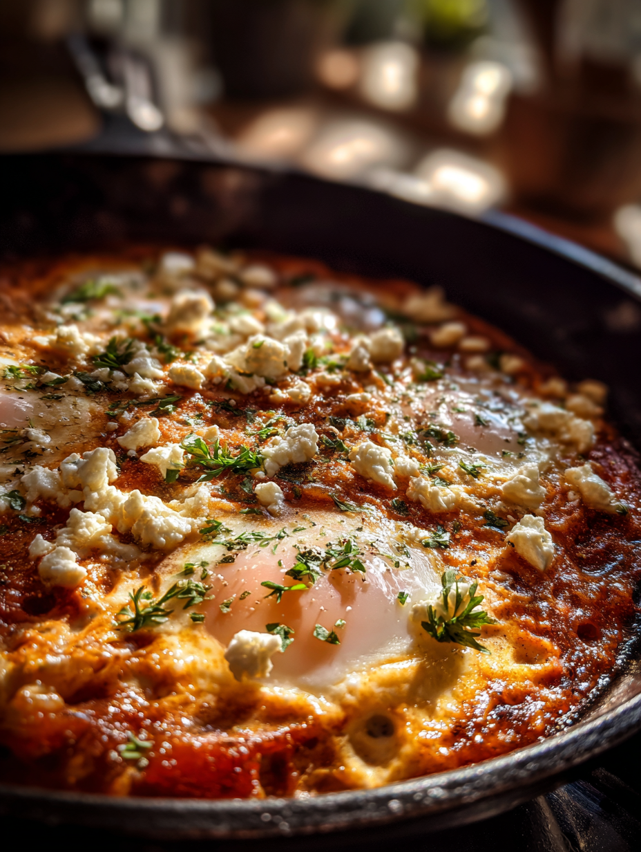 6. Add the Feta Cheese: Once the eggs have cooked to your liking, remove the skillet from the heat. Sprinkle 1 cup of crumbled feta cheese over the top. The heat from the sauce will slightly melt the cheese, creating a creamy topping. Chef’s Note: For a more intense flavor, you can also sprinkle a little extra paprika or some fresh herbs like parsley or cilantro at this point.