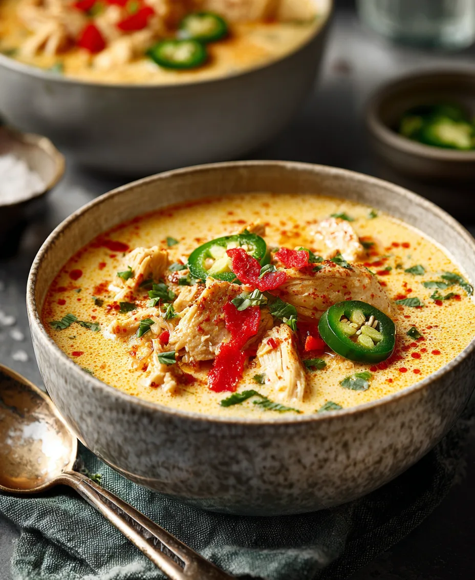 Imagine the creamy and spicy flavors of jalapeo poppers transformed into a comforting soup. This recipe strikes the perfect balance between the heat of jalapeos, the creaminess of cheese, and the heartiness of chicken. It’s a warm hug in a bowl that will satisfy your cravings for something creamy, spicy, and oh-so-comforting.