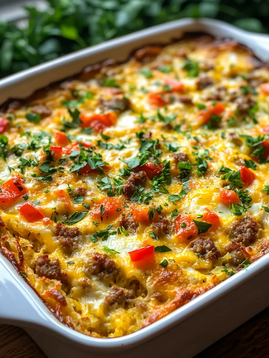 Hash browns act as the base layer for the Sunny Morning Sausage & Egg Breakfast Casserole, providing a hearty foundation that holds everything together. They add a delightful texture and serve to absorb the flavors of the sausage and eggs as they cook. Whether you choose to use frozen hash browns or grate your own, be sure to evenly spread them across the bottom of your baking dish for optimal results.