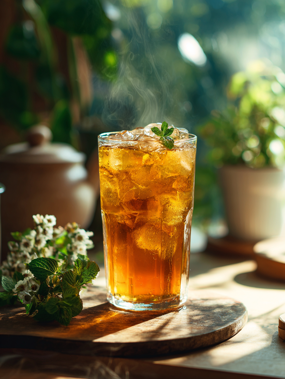 6. Serve: Fill glasses with ice, pour chilled tea, and garnish with mint leaves and lemon slices.